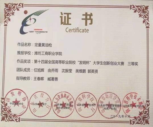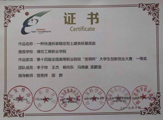 10月26日,第十四届高等职业院校“发明杯”大学生创新创业大赛在山东理工职业学院正式拉开帷幕。经过激烈角逐,我院建筑工程系李子帅、王杰、杨向东、冯德赢、孟鹏涵项目组(指导教师:宫宪祥、邵群)的《一种快速拆装稳定型土建类桩基底座》项目,荣获创意类一等奖;机电工程系任旭辉、由乔雨、沈振莹、类维鹏、郭英贤项目组(指导教师:王春辉、臧著善)的《定量黄油枪》项目荣获发明制作类三等奖。